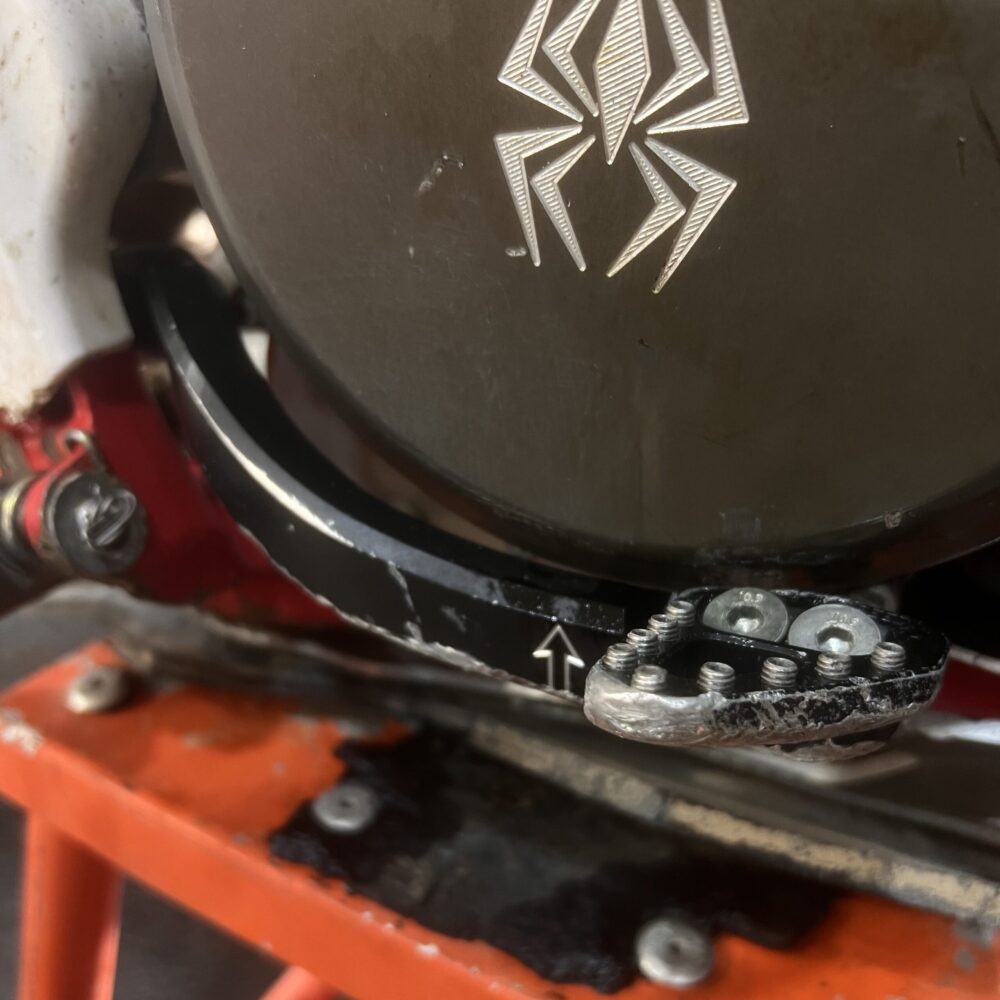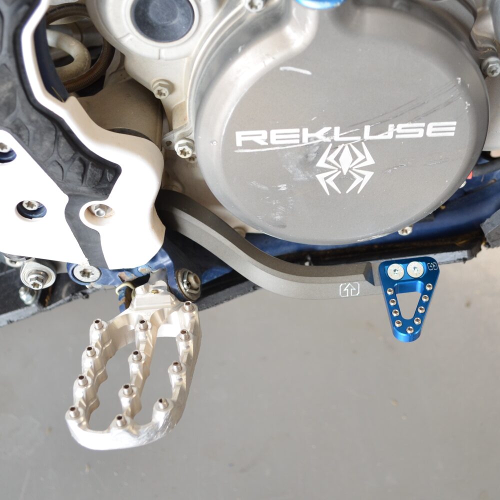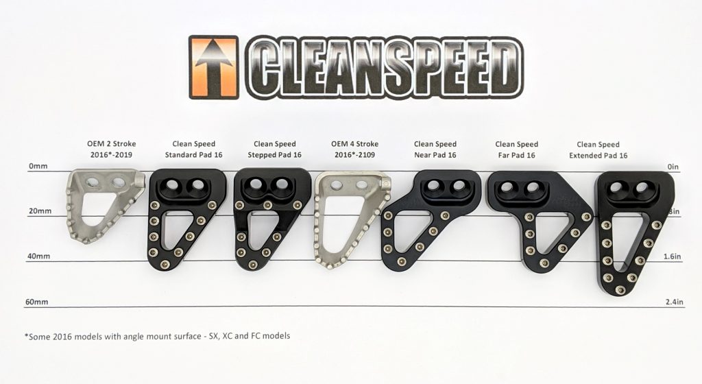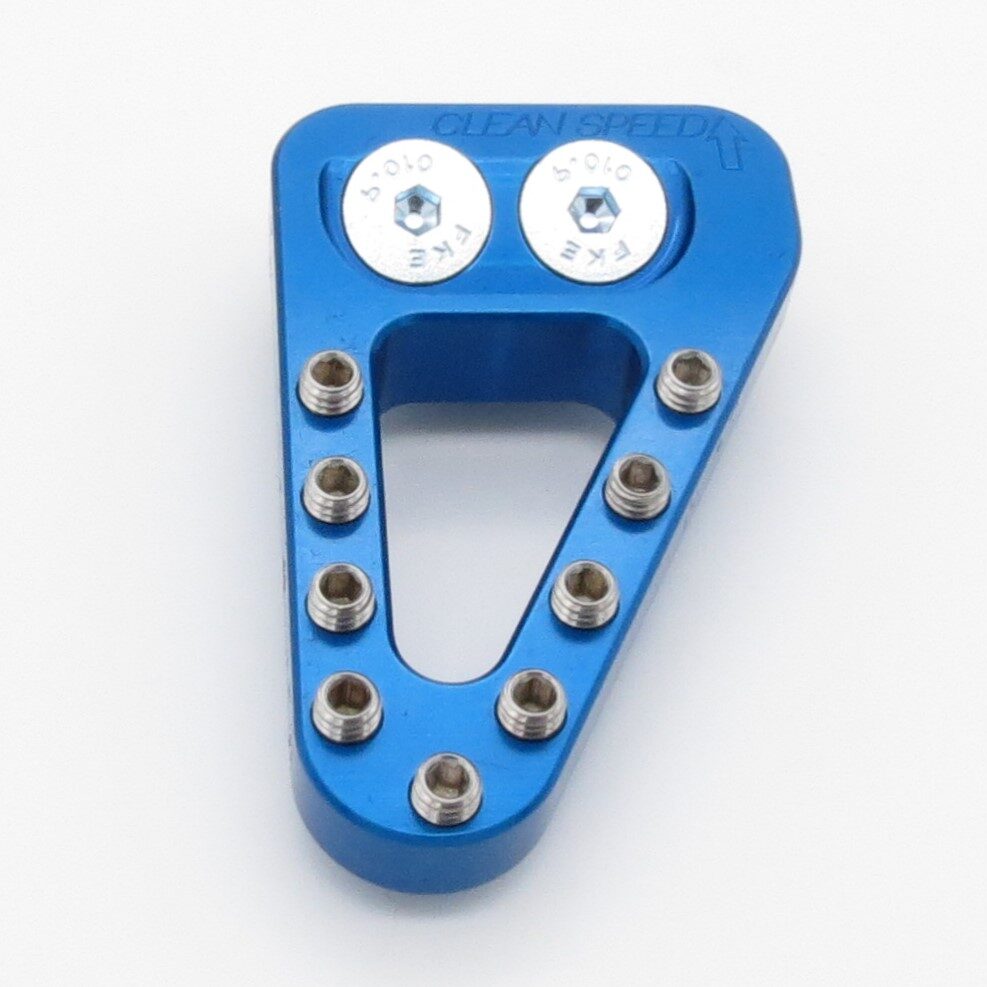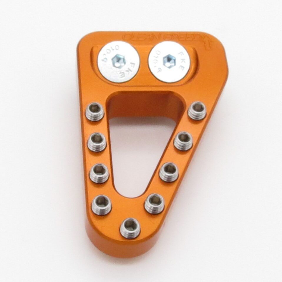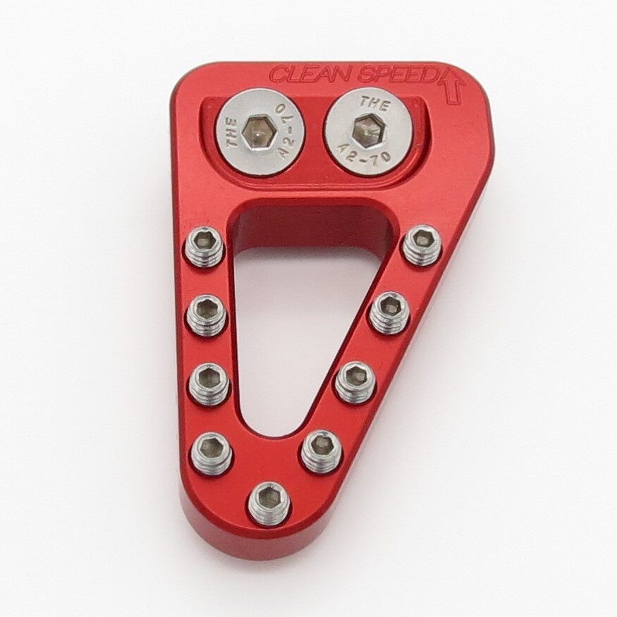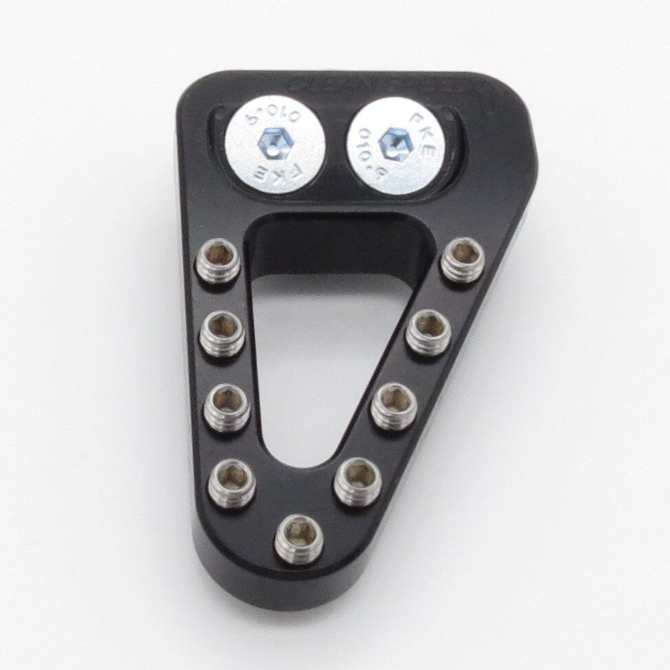 Extended – This rear brake pedal tip is approximately .4″ (10mm) wider than the OEM four stroke tip. If the you commonly miss your brake tip or just feel it is too small, this will give you an extra .4″ (10mm) of pad to catch with your foot. See our Angle Mount Comparison chart to the left or at the top of the page for relative sizing. All of our rear brake pedal tips offer billet strength and a design geometry that makes it much stronger than the stock part. It uses replaceable stainless steel teeth that allow for customization and you can freshen it up if the teeth ever wear down. All required mounting hardware included.