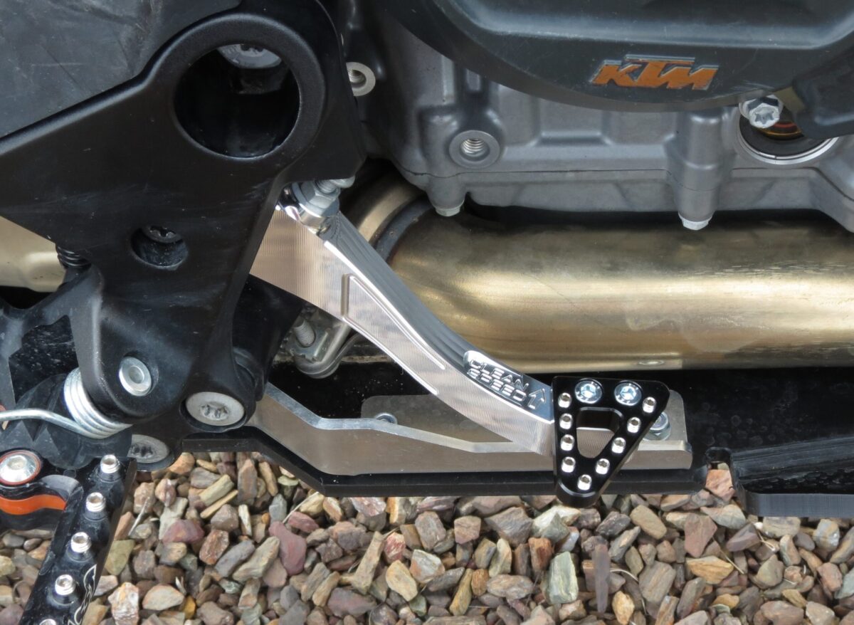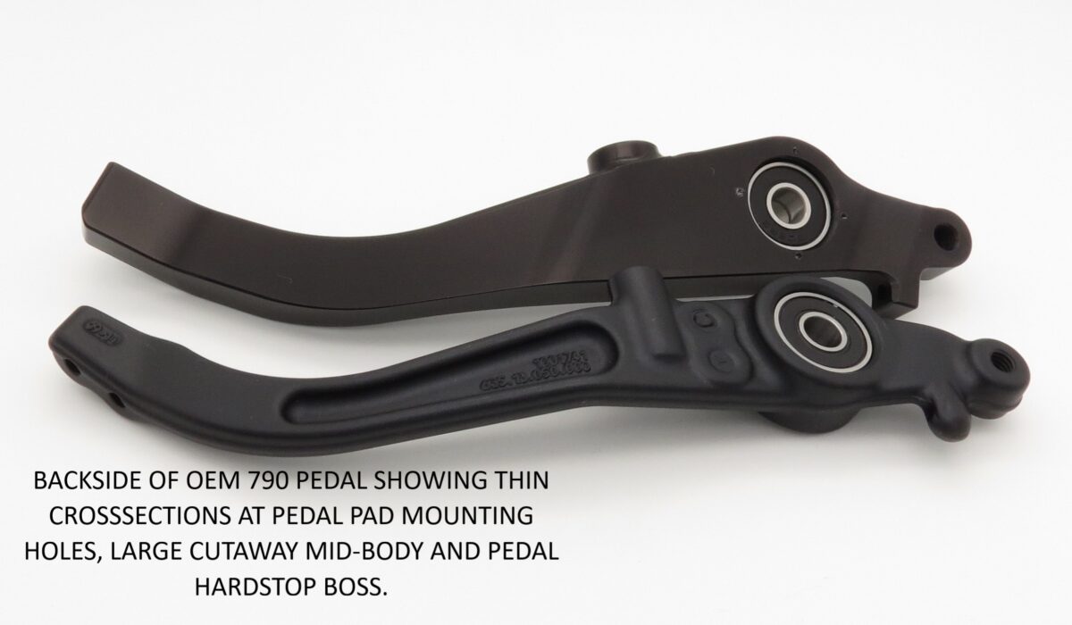 Rear brake pedal for the KTM 790/890, all models 2017-Current. Our pedal is machined from billet aluminum opposed to porous cast, and has a significantly larger cross-section in the areas where the stock pedal has proven to be weak. We use blind mounting holes for the pedal pad screws that yield a ‘C’ shaped cross-section which is much stronger than two parallel walls left from the through holes used on the stock pedal. Unlike other KTM Adventure bikes, the 790/890 uses a bolt for a hard stop that is threaded right in to one of the highest stress areas of the pedal. We maintained the factory adjustability of using a threaded bolt for the hard stop, but made the necessary geometry changes to strengthen this weak area in the event of a hard hit. For extra insurance, we do recommend running a brake snake from the pedal pad to the frame. All of our products are made with pride in the USA.