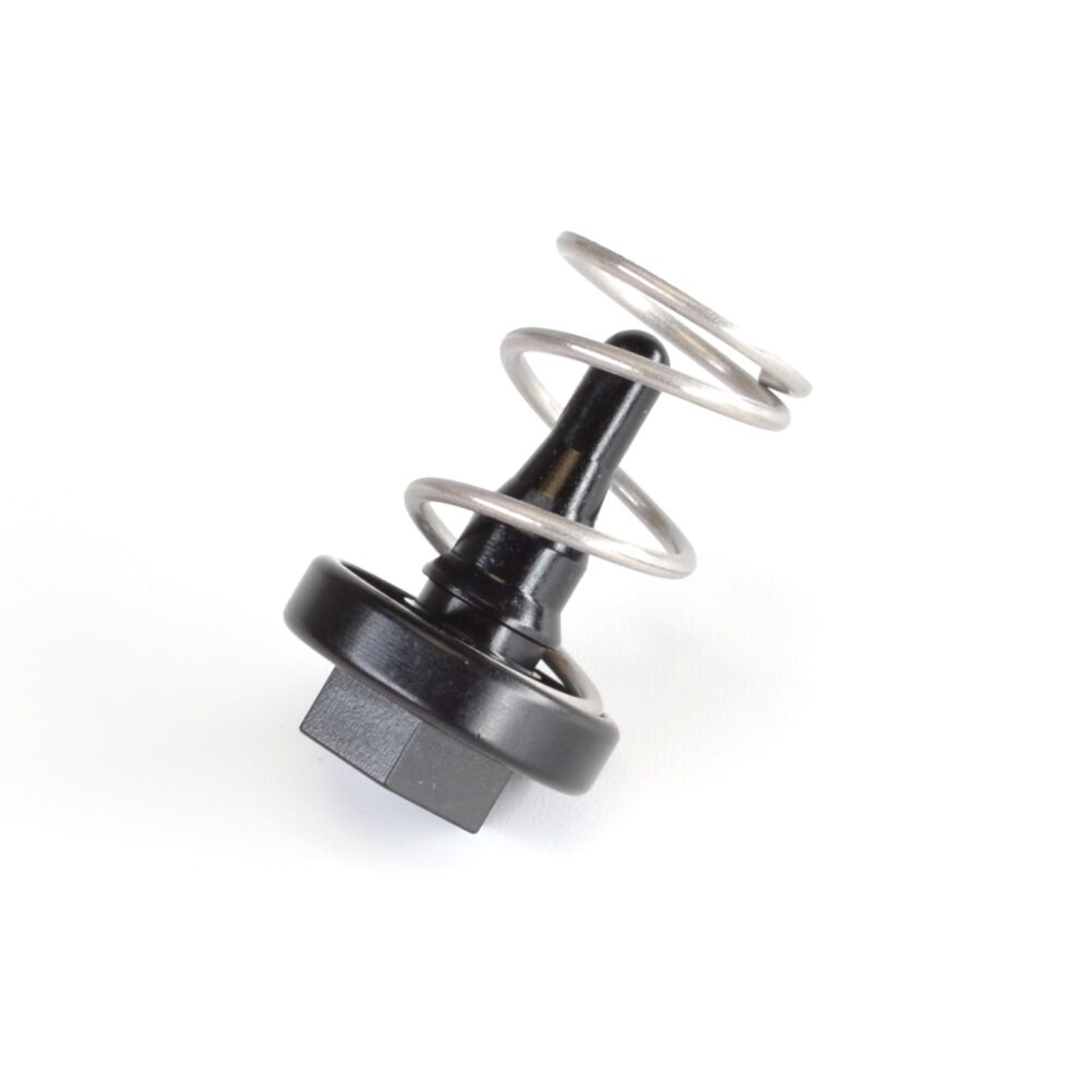 The spring perch is machined from high strength 7075 Aluminum and hard coat anodized to MIL-A-8625, the spring is made from stainless steel.