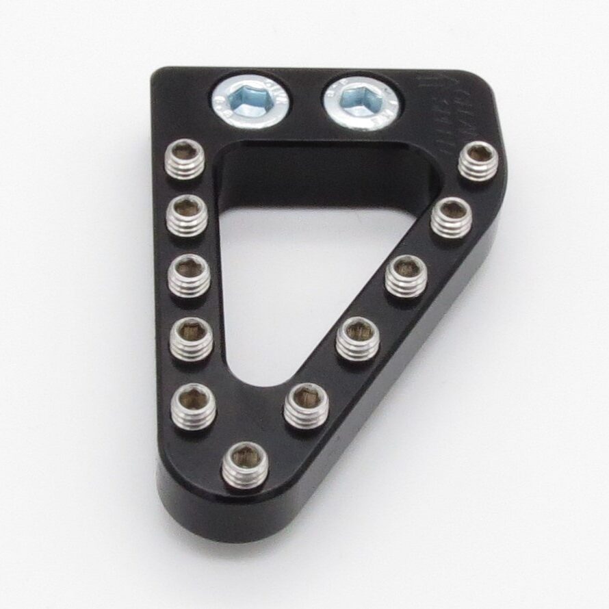 XXL – Major oversized dual-position rear brake pedal tip for KTM and Husqvarna dual-sport and supermotos. This rear brake pedal tip is significantly larger than the stock pedal tip by .4”-.8” (10-20mm). See our comparison chart in the photo gallery for reference. This tip also offers the option of two mounting positions – the stock position and pulled back towards the footpeg .45″ (~11mm). All Clean Speed pedal tips offer billet strength with an extremely grippy surface and customization through the stainless steel teeth